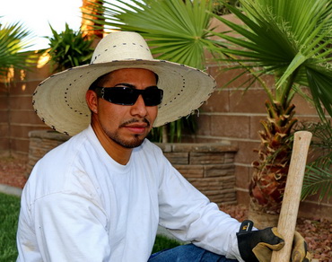 Chris is posing to the camera after laying down some fresh green grass.